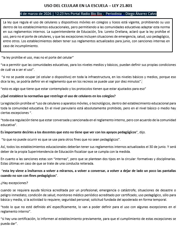 Es importante destacar que, desde hace bastante tiempo atrás, meses y años, según datos recopilados, cada colegio adoptó medidas propias socializadas con apoderados y profesores, y que buscaba disminuir el uso libre del celular en las aulas. En algunos casos se ha logrado pero siempre consensuado con los mismos estudiantes y apoderados, y dependiendo de los niveles educativos.